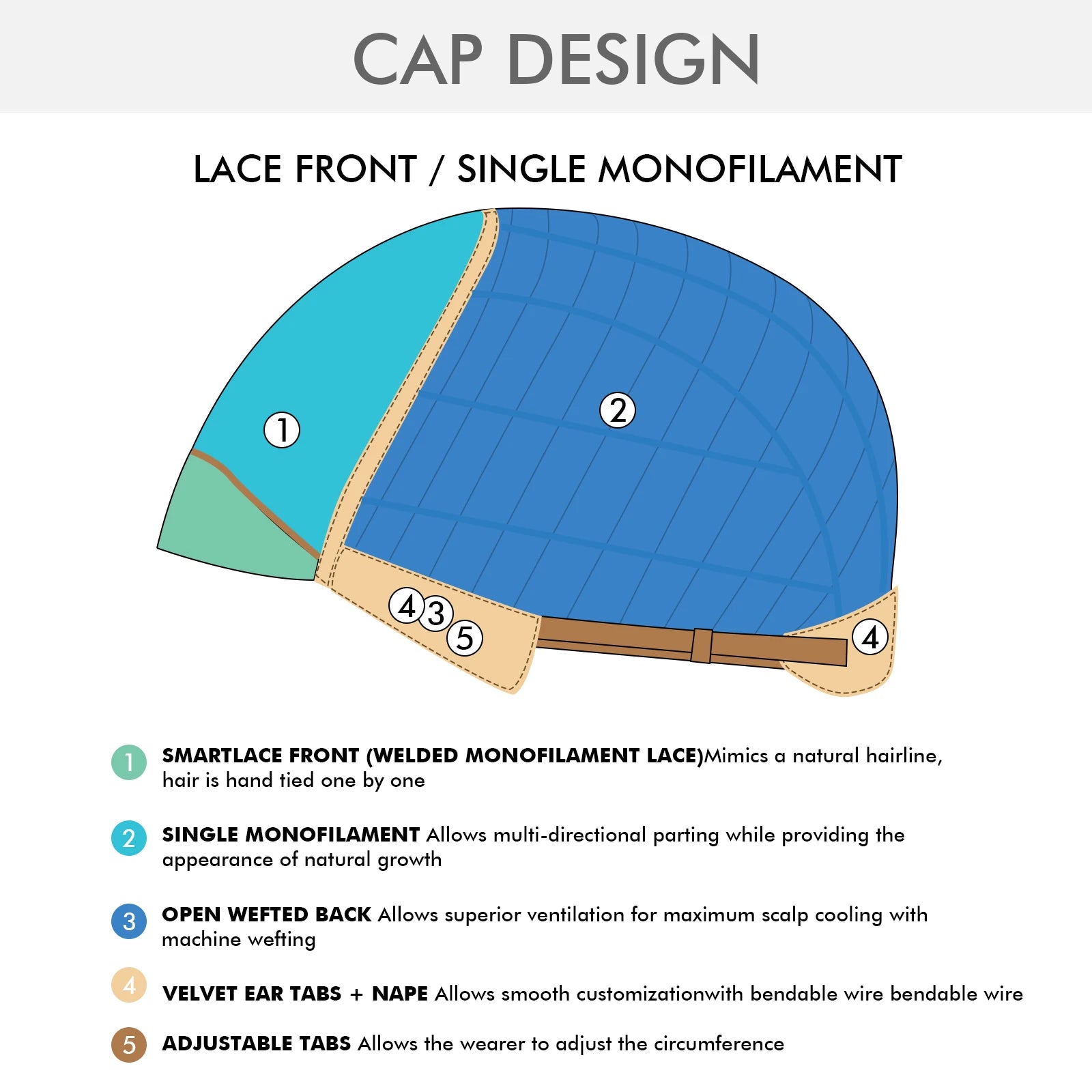 Cap Design: Lace Front, Monofilament, Wefted